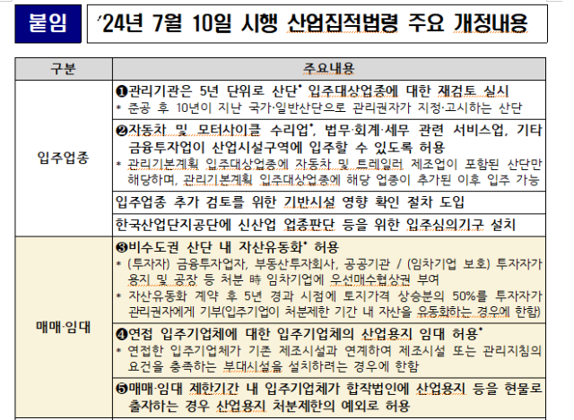 산업부는 "법령이 시행됨에 따라 주요 국가산단의 입주업종을 재검토해 확대를 추진하는 동시에, 앞으로도 기업의 투자를 저해하는 불합리한 규제와 현장 애로를 속도감 있게 개선할 계획"이라고 말했다.