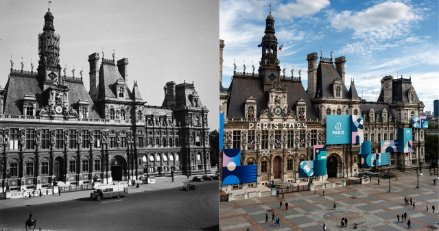 1948년 3월 프랑스 파리 시청 앞을 대중교통버스가 지나가고 있다(왼쪽). 76년이 지난 올해 4월 파리 시청 주변은 개막을 앞둔 올림픽 분위기가 물씬 풍긴다. AFP연합뉴스