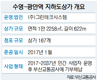 수영~광안역 지하도상가는 조성 8년이 흐르면서 노후화 이미지가 있고 수차례 분쟁에 따른 의구심도 사고 있어 이를 얼마나 빠르게 불식시킬 수 있느냐도 풀어야 할 과제다. 실제 이 지하도상가는 조성 이후 몇몇 사업자가 쇼핑타운을 계획하다 포기하는 등 우여곡절을 겪었다. 운영 업체 관계자는 “지난달 법적 분쟁은 모두 마무리됐으며, 지하상가가 지닌 문제들도 하나둘 해결하고 있다”고 밝혔다.