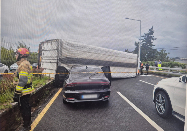 이 사고로 트럭을 몰던 60대 남성과 인근 승용차 운전자 50대 여성 등 2명이 다쳐 병원으로 옮겨졌고, 3개 차로가 통제돼 극심한 정체가 빚어졌다.