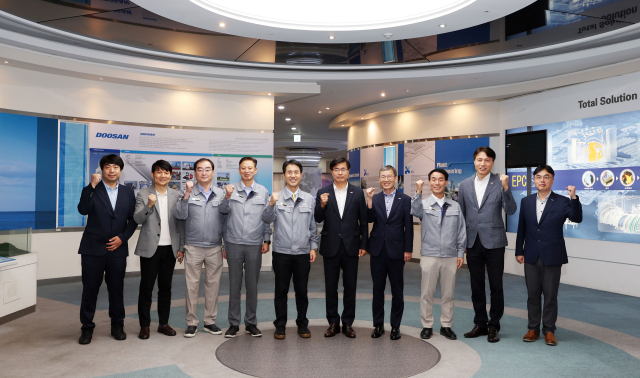 지난 9일 경남 창원 두산에너빌리티 본사에서 열린 ‘표준 가스복합발전 실증과제 추진 현황 보고회’에서 참석자들이 기념촬영을 하고 있다. 남동발전 제공