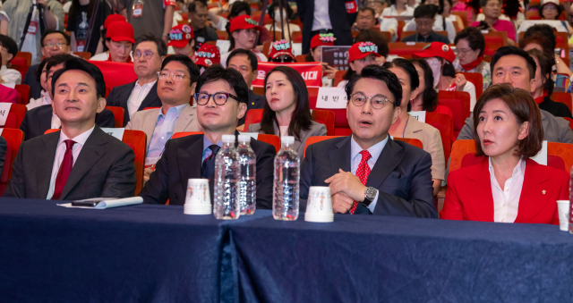 국민의힘 원희룡(앞줄 왼쪽부터), 한동훈, 윤상현, 나경원 당 대표 후보가 10일 오후 부산 벡스코에서 열린 제4차 전당대회 부산, 울산, 경남 합동연설회에서 나란히 앉아 황우여 비상대책위원장의 발언을 듣고 있다. 김종진 기자 kjj1761@