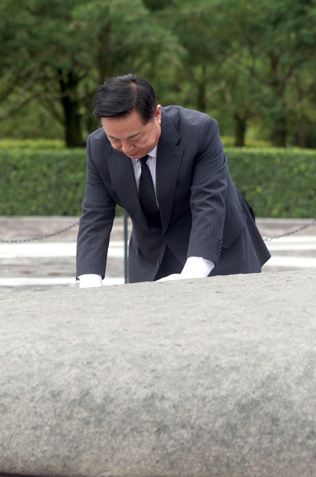 더불어민주당 당 대표 출마 선언을 한 김두관 전 의원이 지난 10일 오후 경남 김해시 진영읍 봉하마을 노무현 전 대통령 묘역을 참배하고 있다. 연합뉴스