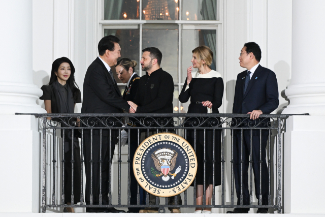 북대서양조약기구(NATO) 75주년 정상회의 참석을 위해 미국을 방문한 윤석열 대통령이 10일 워싱턴DC 백악관에서 열린 공식 환영 만찬 리셉션에 참석해 발코니에서 볼로디미르 젤렌스키 우크라이나 대통령과 인사하고 있다. 연합뉴스