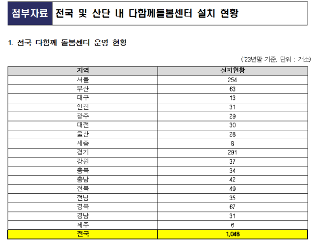 다함께돌봄센터는 6세~12세 이하 아동에게 초등학교 정규교육 이외의 시간, 야간 또는 긴급상황 발생 시 돌봄서비스를 제공하는 곳이다. 다함께돌봄센터는 2018년 시행 초기 전국 17개소에 불과했으나 2023년 말 기준 1048개가 운영되는 등 지역별로 매년 수요가 지속적으로 늘어나고 있다. 그러나 전국적으로 다함께돌봄센터는 주거지역에 밀집돼 운영되다 보니 산단 내 근로자들은 이를 이용하지 못하는 어려움이 있다.