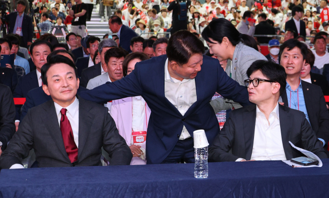 국민의힘 대표 원희룡(왼쪽), 한동훈(오른쪽) 후보가 지난 12일 대구 엑스코에서 열린 제4차 전당대회 대구·경북 합동연설회에서 권영진 의원과 대화하고 있다. 연합뉴스