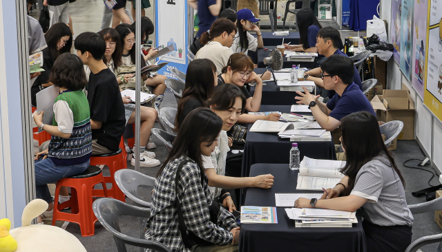 14일 부산 해운대구 벡스코에서 열린 ‘2024 대입 상담 캠프’ 참석자들이 2025학년도 대입 수시모집 등 맞춤형 상담을 하고 있다. ‘나의 성공적인 대입을 위한 팝업스토어’라는 슬로건 아래 13일과 14일 이틀간 열린 이번 행사에는 부산과 서울 등 주요 대학 76곳과 한국장학재단, 학력개발원 2개 기관이 참여했다.