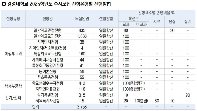 경성대는 2025학년도 수시모집에서 전체모집 인원 2920명 중 94%인 2758명을 선발한다. 수능최저학력기준은 약학과와 간호학과(일부전형)만 적용한다. 약학과의 경우 전년도 대비 지역인재(저소득), 농어촌, 저소득층전형 수능최저학력기준이 완화됐다. 그 외 모집단위에서는 수능 응시 여부와 관계없이 수시모집 모든 전형에 지원이 가능하다.