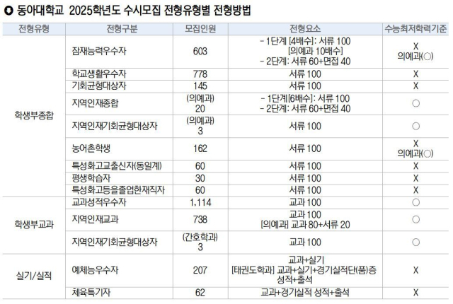 동아대는 수시모집에서 학생부종합, 학생부교과, 실기위주 전형으로 2025학년도 총 모집인원의 90%를 선발한다. 모든 전형은 교차 지원이 가능하다.