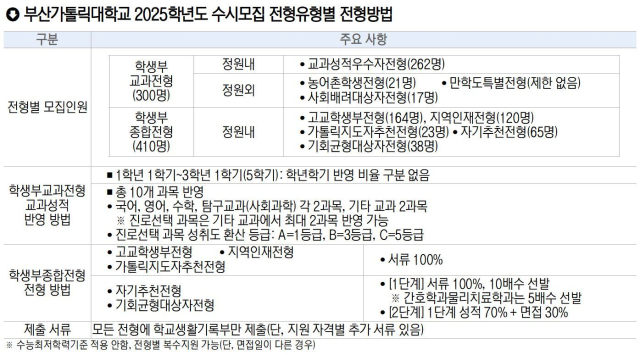 부산가톨릭대는 2025학년도 신입생 총 735명을 선발하며, 수시모집에서 전체 모집인원의 96.6%에 해당하는 710명을 선발한다.