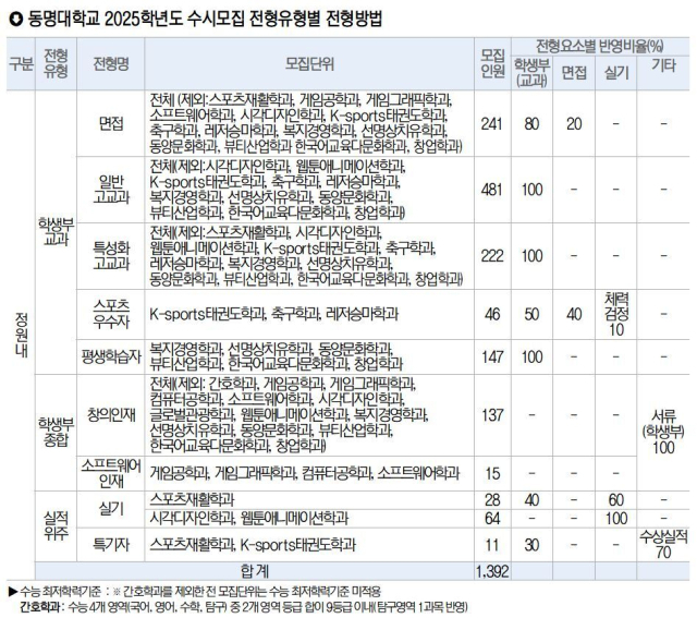 동명대학교는 2025학년도 정원 내 모집인원의 97.8%인 1392명을 수시모집으로 선발한다. 수시모집 원서 접수는 오는 9월 9일부터 13일까지다. 학생부교과전형으로는 면접전형, 일반고교과전형, 특성화고교과전형, 스포츠우수자전형, 평생학습자전형이 있다.