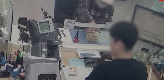 울산 한 아파트 화단에서 발견된 7500만 원 현금의 주인으로 밝혀진 80대 노인이 울산시 중구 한 시중은행 지점에서 거액의 현금을 인출하고 있다. 울산경찰청 제공
