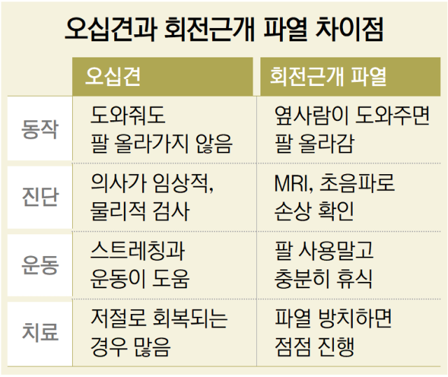 오십견과 회전근개 파열을 가장 쉽게 구별하는 방법이 있다. 환자의 팔을 옆에서 다른 사람이 들어 올려보는 것이다. 오십견은 옆에서 도와주어도 팔이 올라가지 않는다. 어깨가 딱 굳어 있어서 다른 사람이 거들어도 통증만 유발될 뿐 올라가지 않는다.