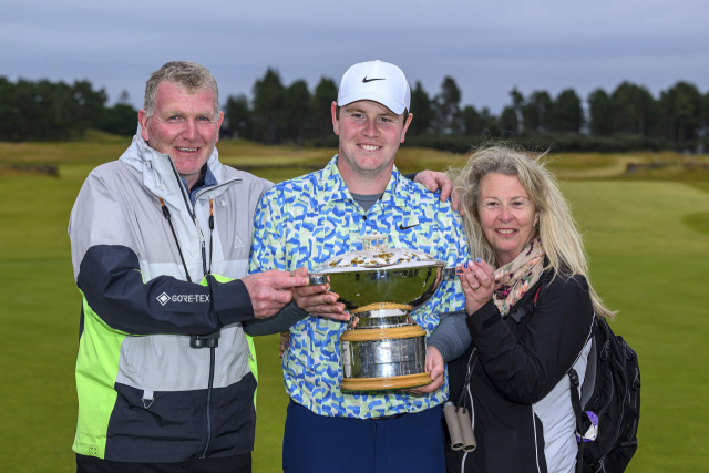 로버트 매킨타이어(스코틀랜드)가 15일 영국 스코틀랜드 노스베릭의 르네상스 클럽에서 열린 미국프로골프(PGA) 투어와 DP 월드투어가 공동 주관한 제네시스 스코틀랜드오픈에서 우승한 후 부모와 함께 기념 촬영을 하고 있다. 지난해 이 대회에서 준우승을 차지한 매킨타이어는 지난달 RBC 캐나다오픈에 이어 투어 2승을 수확했다. 막판 대역전을 노렸던 임성재는 공동 4위에 올랐다. AP연합뉴스