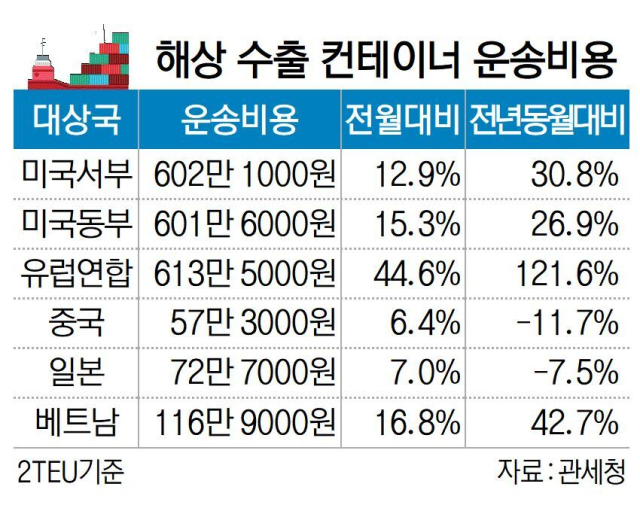 관세청은 “미 서부로 가는 운송비용은 3개월 연속 상승했고 미 동부와 유럽연합행은 2개월 연속 올랐다”고 말했다.