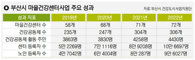 당초 2008년 부산시가 전국 시도 중 가장 연령표준화사망률이 높고, 기대수명이 가장 낮다는 조사 결과에 따라 건강마을사업이 시작됐다. 건강마을사업은 2016년 마을건강센터사업으로 전환했고, 센터도 16개에서 출발해 지난해 75개로 늘어났다.