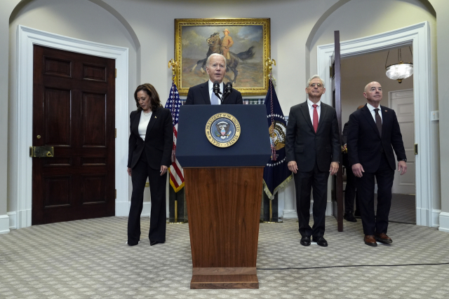 조 바이든 대통령이 14일(현지시간) 백악관 루스벨트 룸에서 연설하고 있다. AP연합뉴스연합뉴스