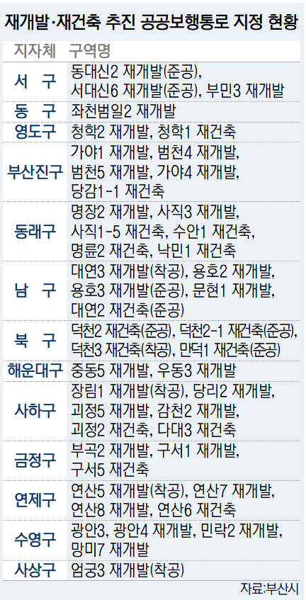 부산시에 요청해서 받은 ‘주택건설사업계획승인 사업장 중 지구단위계획에 의한 공공보행통로 지정 현황’ 자료를 보면, 부산 지역에는 전체 29개 아파트 단지에 공공보행통로가 설치돼 있다. 이 중 강서구와 기장군 등 시 외곽 지역 공공택지에 있는 아파트 단지가 12곳으로 가장 많았다.