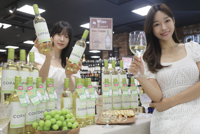 이마트가 칠레산 화이트 와인 ‘도스코파스 소비뇽 블랑’을 초저가인 4900원에 선보인다. 상큼한 과일향이 특징인 이 와인은 전국 이마트와 이마트 에브리데이에서 구매할 수 있다. 이마트 제공