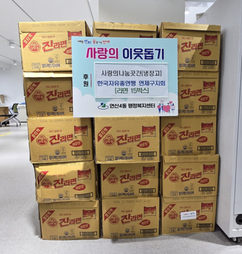 부산 연제구 연산4동(동장 김외경)은 지난 15일 강생일 한국자유총연맹 연제구지회장으로부터 라면 15박스를 기탁받았다.