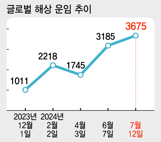 해상운임 급등은 지난해 말 예멘 후티 반군의 공격에 따른 홍해 운항 선박들의 우회, 2~3분기 재화 소비 증가 등 때문이다. 2~3분기는 여름 휴가철, 추수감사절, 블랙 프라이데이 등을 앞두고 물류 수요가 늘어 해운업에는 성수기다. 중국발 ‘물량 밀어내기’도 정점에 달한 상태다. 미국이 8월부터 중국에 대한 높은 관세를 예고하면서, 그 전에 물량을 보내려는 수요가 폭증했다.