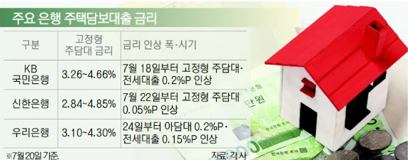 하나은행은 이미 지난 1일 주택담보대출 금리를 최대 0.2%P 인상했다. KB국민은행도 이달 3일 주택담보대출 금리를 0.13%P, 11일 전세자금대출 금리를 최대 0.2%P 높였고, 신한은행 역시 15일 금융채 5년물 금리를 기준으로 하는 모든 대출 상품 금리를 0.05%P 인상한 바 있다.