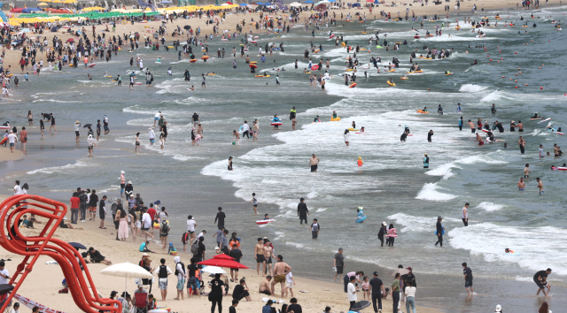 휴일인 21일 오후 모처럼 맑은 날씨 속에 부산 해운대구 해운대해수욕장에 많은 피서객이 몰려 무더위를 식히고 있다.