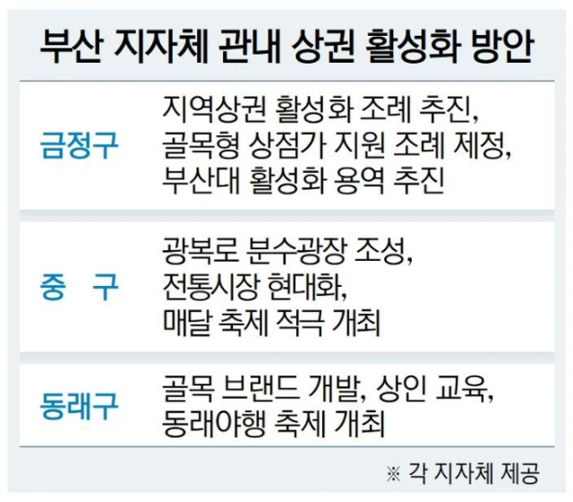부산대·남포동·동래역 등 한때 부산 핵심 상권으로 꼽히던 지역들이 빠른 속도로 쇠퇴(부산일보 7월 2일 자 3면 보도)하면서 관할 지자체에도 비상이 걸렸다. 상인, 건물주 등이 참여하는 태스크포스(TF)를 꾸려 대책 마련에 들어가는가 하면, 매달 축제를 열어 더 많은 사람이 찾을 수 있도록 하겠다는 지자체도 나왔다.
