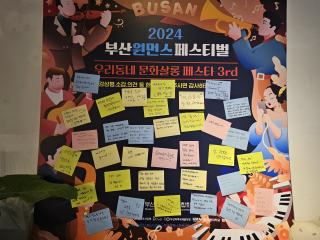 노란색 포스트잇에 꾹꾹 눌러 쓴 소감이 ‘2024 부산 원먼스 페스티벌-우리 동네 문화살롱 페스타 3rd’ 의견 개진 게시판을 빼곡히 장식했다. 감상평, 개선점 등 뭐든지 적어 달라는 주최 측 요청에 관객이 남긴 메시지였다. 그날 본 공연 소감부터 ‘부산 원먼스 페스티벌’이나 부산의 작은 공연장에 대한 기대와 주문 등 다양했다.