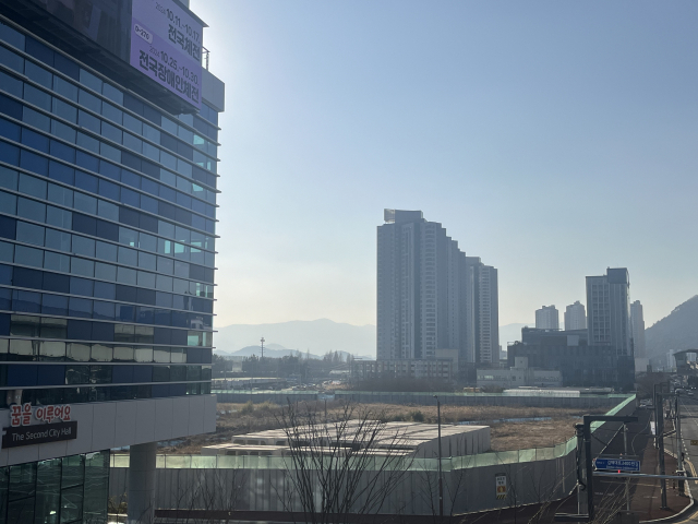 경남 김해시가 NHN 데이터센터 사업이 취소된 김해시청 앞 부지에 공동주택 건립을 검토 중이다. 사진은 사업대상지 전경. 이경민 기자