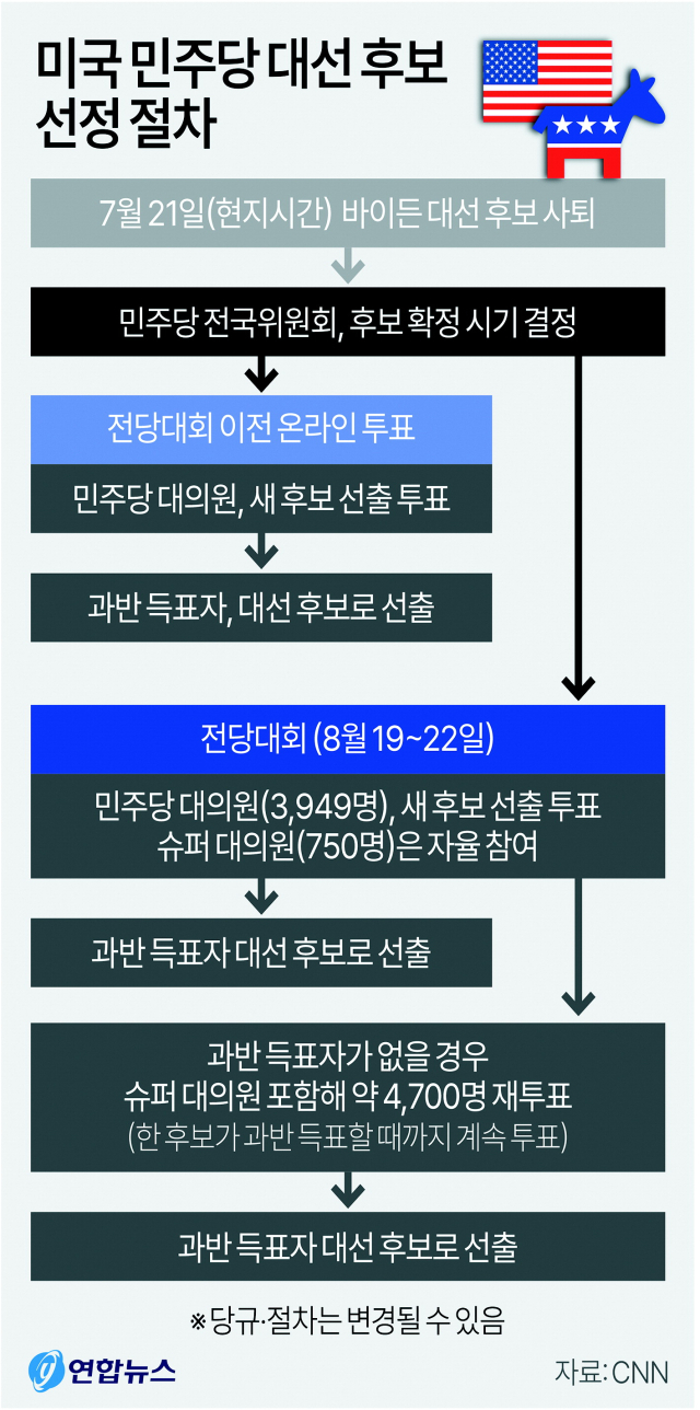민주당이 이를 고수할 경우 물리적 시간을 감안하면 바이든 대통령이 지지 선언한 카멀라 해리스 부통령에게 유리할 전망이다.
