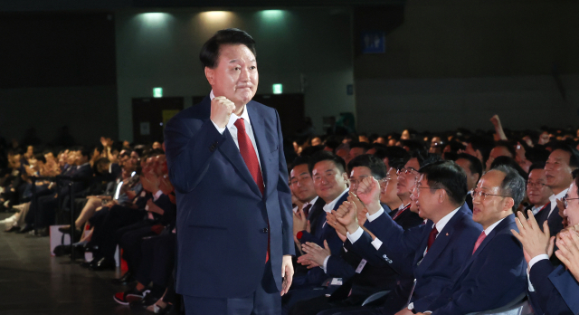 윤석열 대통령이 23일 오후 경기 고양시 킨텍스에서 열린 국민의힘 제4차 전당대회에 참석, 황우여 비상대책위원장의 소개 뒤 자리에서 일어나 주먹을 쥐어보이고 있다. 연합뉴스
