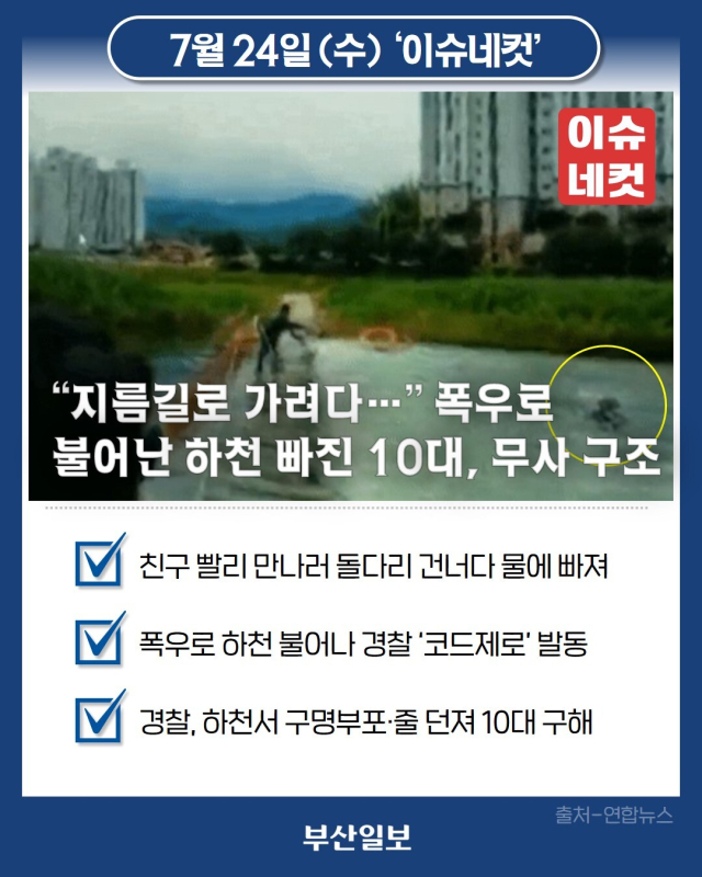 돌다리를 건너다 미끄러진 10대가 폭우로 불어난 하천에 휩쓸렸다 경찰에 구조됐습니다.