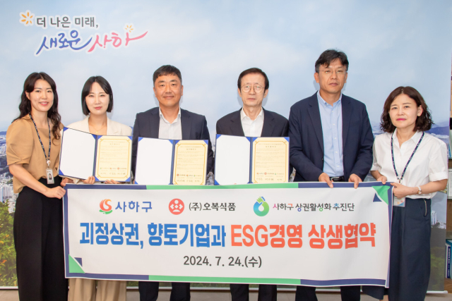 부산 사하구(구청장 이갑준)는 24일 (주)오복식품, 올빚찬주, 사하구상권활성화추진단과 ‘ESG경영 상생협약’을 체결했다.