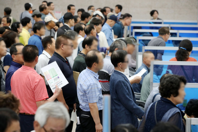 최근 우리나라의 65세 이상 인구가 1000만 명을 넘어서면서 노인 연령 기준 재조정을 비롯해 연금 개혁·노인 일자리 정책 등 초고령사회에 대비한 사회 체계의 재정비를 서둘러야 한다는 지적이 잇따르고 있다. 몇 년 전 지역 기업이 부산에서 마련한 장·노년일자리박람회에서 구직자들이 현장 면접을 보는 장면(위쪽)과 공원에서 무료하게 시간을 보내고 있는 노인. 부산일보DB
