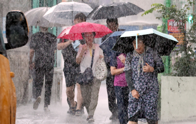 24일 오후 부산 동구의 한 거리에서 시민들이 갑작스럽게 내린 많은 비에 힘겹게 걸어가고 있다. 부산에는 이날 새벽 일부 지역에 시간당 80mm 이상의 극한 호우가 내렸다.