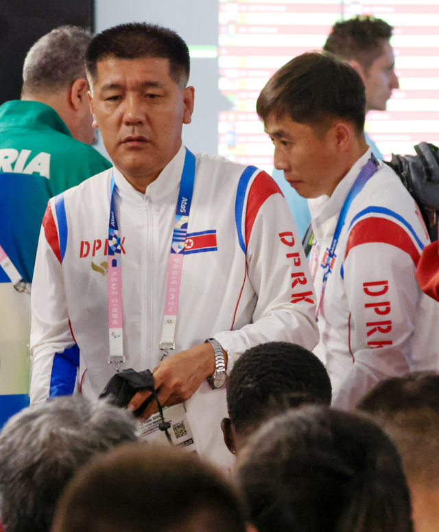 24일(현지시간) 프랑스 파리 사우스파리아레나4에서 열린 탁구 여자 단식 조 추첨식이 끝난 뒤 북한 스포츠 국제업무 담당자 장성남(왼쪽) 김혁봉 코치가 행사장을 떠나고 있다. 8년 만에 하계 올림픽에 출전하는 북한은 기계체조, 육상, 복싱, 수영 다이빙, 유도, 탁구, 레슬링 7개 종목에 남자 4명, 여자 12명을 합쳐 16명의 선수단을 파견했다. 연합뉴스
