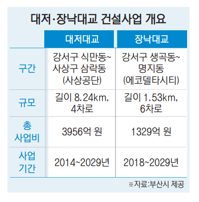 한편, 두 대교에 대한 추가 절차가 정상적으로 이뤄지면 대저대교는 다음 달, 장낙대교는 내년 2월 공사에 들어간다. 에코델타시티 접근 도로망으로 추진하는 엄궁대교는 올 하반기 소규모 환경영향평가가 예정돼 있다.