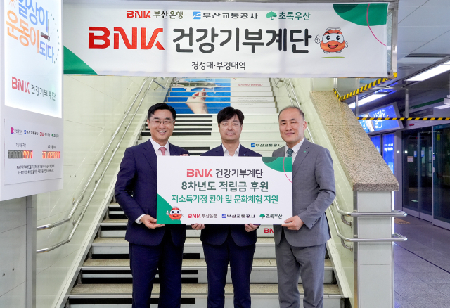 BNK부산은행(은행장 방성빈)은 지난 26일 부산지하철 2호선역인 경성대·부경대역 승강장에서 ‘BNK건강기부계단’을 통해 모인 적립금을 초록우산어린이재단 부산지역본부에 전달했다.