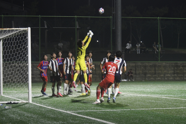지난 27일 경남 고성군에서 열린 제61회 청룡기 전국고등학교축구대회 16강전, 동래고와 이리고의 경기에서 동래고 골키퍼 이세민이 공을 쳐내고 있다. 부산시축구협회 제공