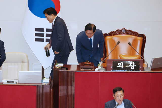 '방송 4법' 필리버스터가 사흘 연속 계속된 28일 오후 국회 본회의에서 우원식 국회의장과 더불어민주당 소속 이학영 국회부의장이 본회의 사회를 교대하고 있다. 국민의힘 소속 주호영 국회 부의장이 '방송 4법' 처리를 위한 국회 본회의 사회를 거부함에 따라 우 의장과 이 부의장은 3시간마다 번갈아 가며 의장석을 지키고 있다. 연합뉴스