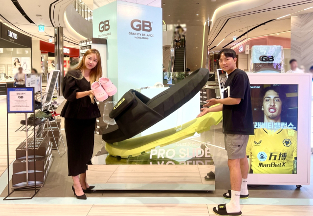 신세계백화점 센텀시티점은 다음 달 23일까지 몰 지하 2층에서 골스튜디오의 ‘그래비티 밸런스’를 선보인다. 황희찬 선수가 소속된 울버햄튼의 공식 슬리퍼로 선정돼 유명하다. 신세계백화점 제공