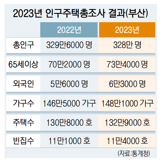 부산 인구는 328만명이었다. 불과 5년 만에 11만 6000명이 줄어들었다. 부산 인구를 유소년(0~14세) 생산연령(15~64세) 고령인구(65세 이상)로 나누면 고령인구가 73만 4000명으로, 한해 전보다 3만 2000명이 늘어났다. 유소년과 생산연령 인구는 줄었다.