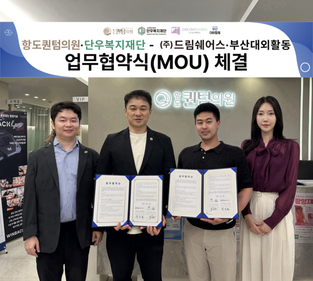 항도퀀텀의원(회장 김만률)과 단우복지재단(이사장 정찬률)은 최근 (주)드림쉐어스·부산대외활동(대표 공준식)과 상호협력을 위한 협약을 체결했다.