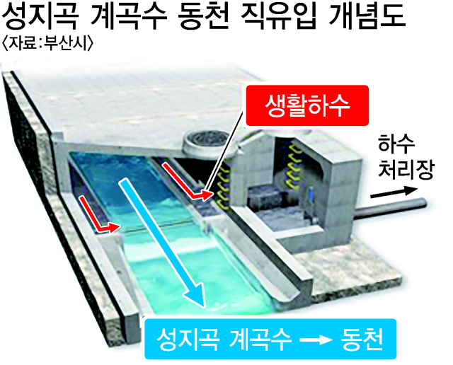 30일 부산시에 따르면 시는 성지곡 수원지에서 부전천을 거쳐 빗물·오수와 함께 하수처리장으로 흘러가던 성지곡 계곡물을 동천으로 직접 유입시키는 ‘부전천 상류 성지곡 계곡수(계곡물) 동천 직유입 사업’을 오는 9월부터 시작한다. 이와 함께 수질 개선을 위해 동천에 해수를 끌어오는 해수도수 관로 보수와 악취의 원인이 되는 슬러지를 제거하는 준설사업도 함께 내년 6월까지 진행한다. 투입되는 예산은 시비 41억 원이다.