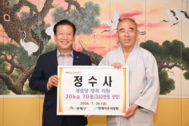 부산 연제구(구청장 주석수)는 지난달 25일 정수사(주지 원광스님)로부터 양곡 20kg 70포를 기탁받아 연제구 경로당 70개소에 전달했다.