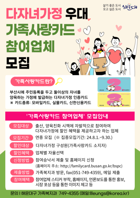 부산시 해운대구(구청장 김성수)는 다자녀가정의 양육 부담을 줄이기 위해 ‘다자녀가정 우대 가족사랑카드 참여업체’를 모집한다.