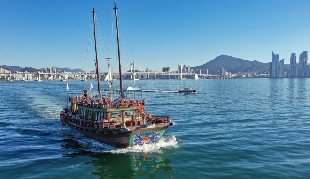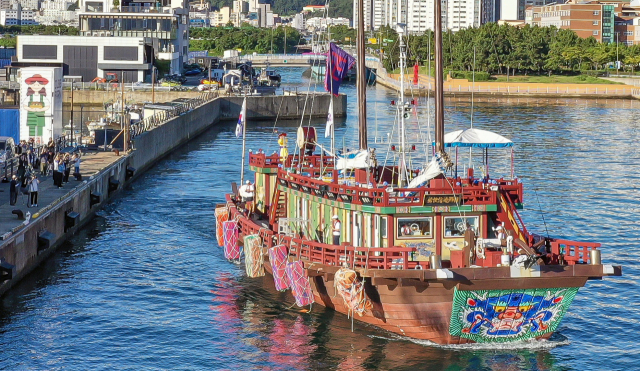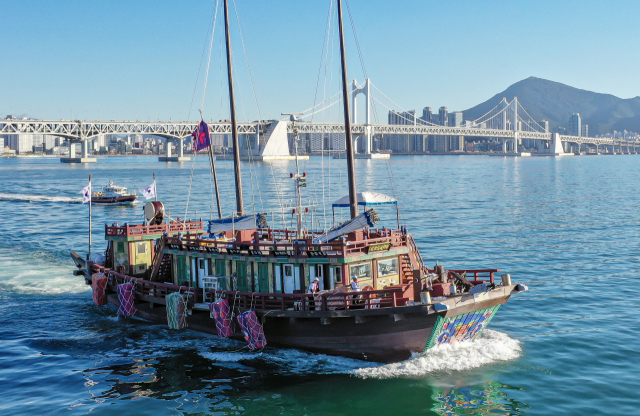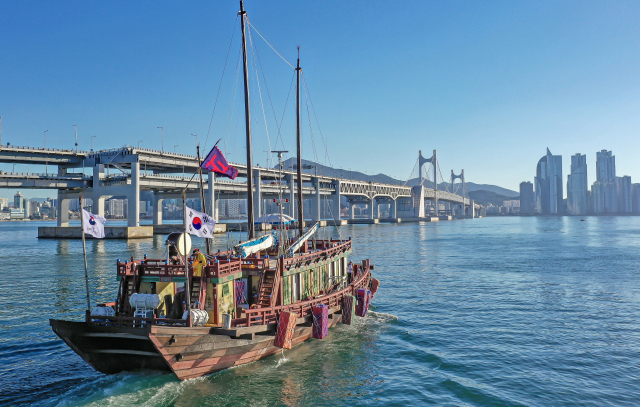 31일 오전 부산 남구 용호별빛공원 앞 부두에서 조선통신사선 재현선이 일본으로 출항하고 있다. 조선통신사선이 일본 본토에 상륙하는 것은 1763년(영조 39년)부터 1764년까지 걸쳐 이뤄진 계미사행 이후 260년 만이다. 김종진 기자 kjj1761@
