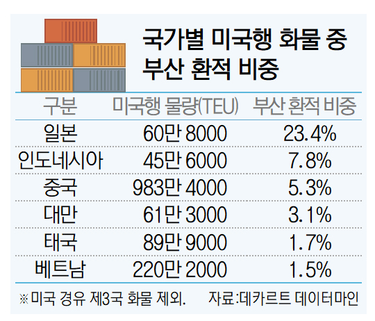 일본 입장에서는 부산항이 최대 환적항이다. 실제 BPA에 따르면 일본의 수출입 물량 중 10%가량이 부산항에서 환적되는 것으로 알려졌다. 지난해 미국행 물량의 경우 전체 60만 8000TEU 중 무려 23%가량(14만 2000TEU)이 부산항에서 환적했다. 지난해 중국의 경우 미국행 물량 중 부산항 환적 비중이 5.3%였으며 인도네시아(7.8%), 대만(3.1%), 태국(1.7%) 등도 일본보다 크게 낮았다.
