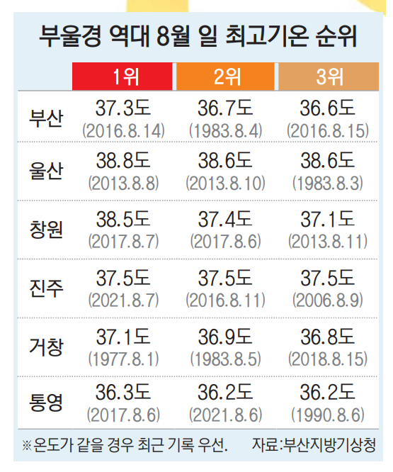 반면 7월 역대 일 최고기온은 부산은 1994년 7월 24일의 35.8도, 울산은 1994년 7월 14일의 38.2도, 창원은 1994년 7월 20일 39.0도였다. 창원을 제외하면 대체로 부울경에서 7월보다 8월이 더 더웠다.